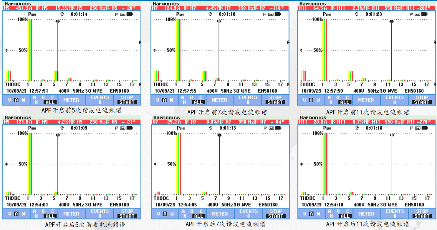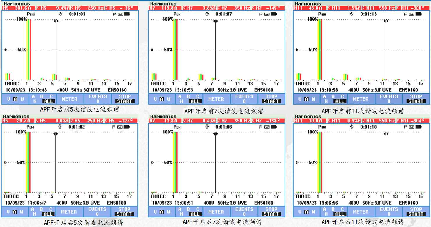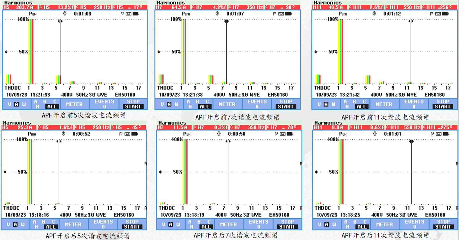 3#變壓器APF運(yùn)行后可以看出,諧波電壓總畸變率從7.3%降至3.5%,諧波電流總畸變率從10.5%降至1.3%,5次諧波電流畸變率由9.4%濾除至0.6%,7次諧波電流畸變率由3.8%濾除至0.4%,11次諧波電流畸變率由1.5%濾除至0.3%。